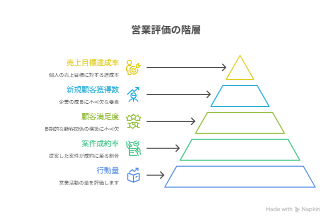 営業職の評価基準は、多岐にわたる成果指標を含むべきです。売上高や新規顧客の獲得数、契約の更新・維持などの定量的指標はもちろん重要ですが、これにとどまりません。