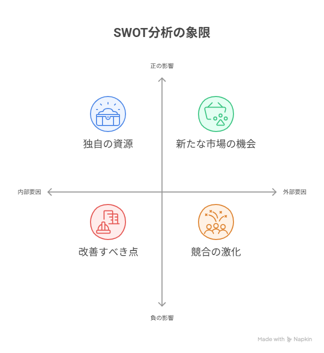 また、強みを活かして競争優位を築くことも重要です。一方で、弱みについては、その弱点を克服するための戦略を策定します。