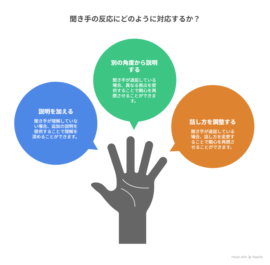 聞き手が興味を持ち、理解を深めるような話し方を身につけることが重要です。そのためには、言葉選びや話の構成力を鍛える必要があります。さらに、受講者の反応を見ながら、内容をその都度調整するスキルも不可欠です。
