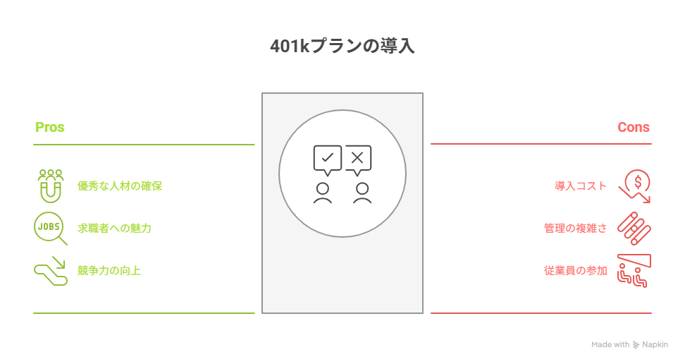 最終的に、従業員の満足度向上につながり、企業の信頼性や競争力を高める一助となります。中小企業の経営者は、長期的な視点で401kを検討することが重要です。